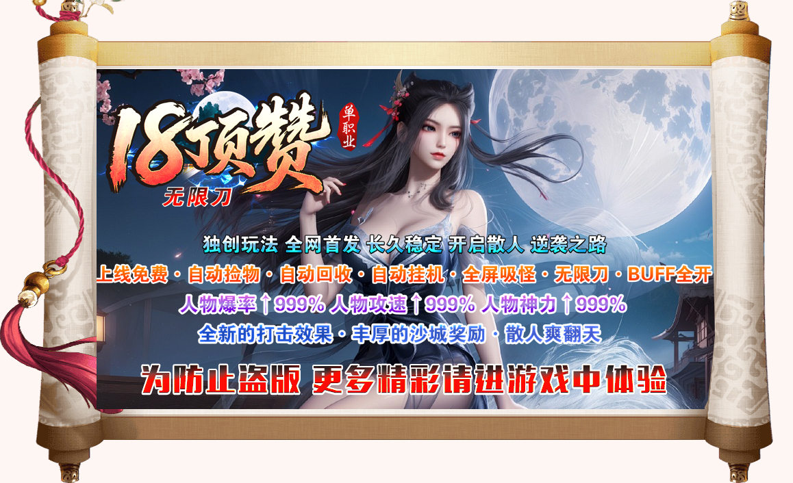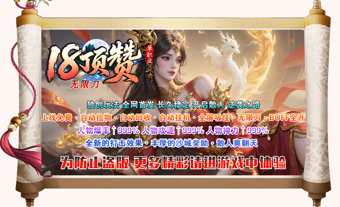 ◆18顶赞◆120格大背包◆免费自动挂机◆免费自动回收◆免费自动捡取◆自动吸怪◆自动穿戴◆无限刀◆